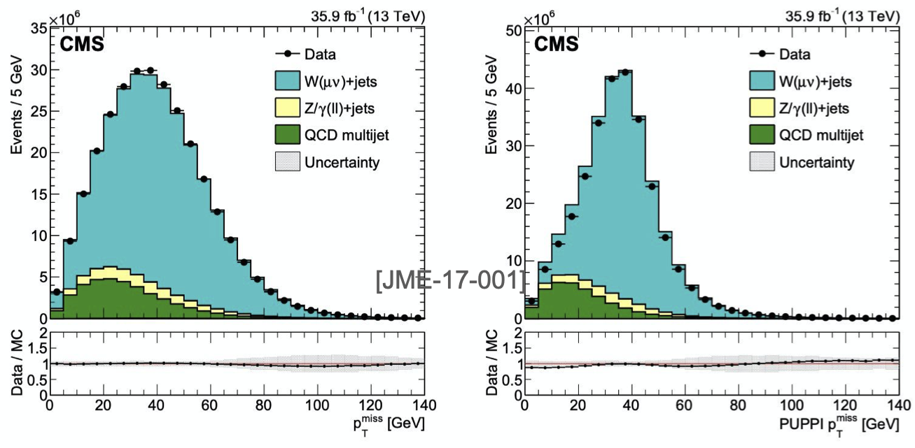The figure below presents the MET distribution for both PF MET and PUPPI MET in events with leptonically decaying W bosons, demonstrating the improved performance achieved with PUPPI MET.