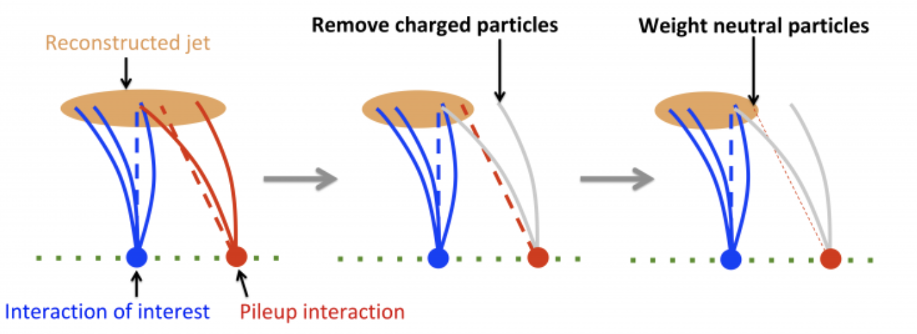 The PUPPI (Pileup Per Particle Identification) algorithm applies inherently local corrections by leveraging specific properties of particles. Particles originating from the hard scatter process are typically geometrically close to other particles from the same interaction and generally exhibit higher pT. In contrast, pileup particles lack shower structures, have lower pT on average, and are uncorrelated with particles from the leading vertex.