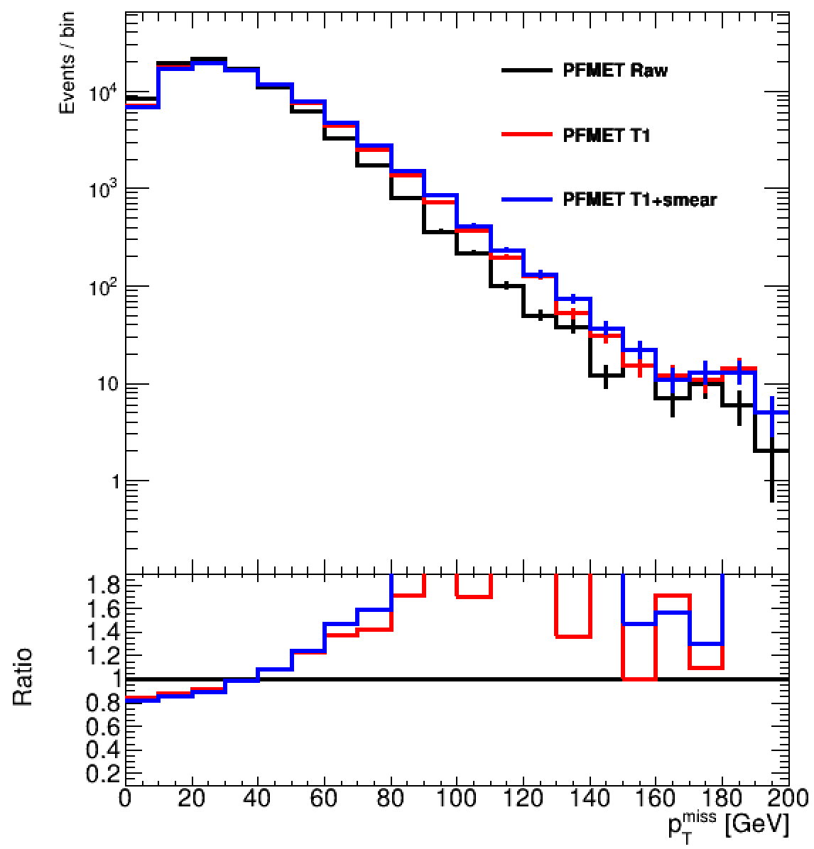 Once the process completes (it will take a few seconds), it will produce a ROOT file. We will then compare the 1D distribution of different MET flavors in a Z+jets sample (which has no genuine MET).