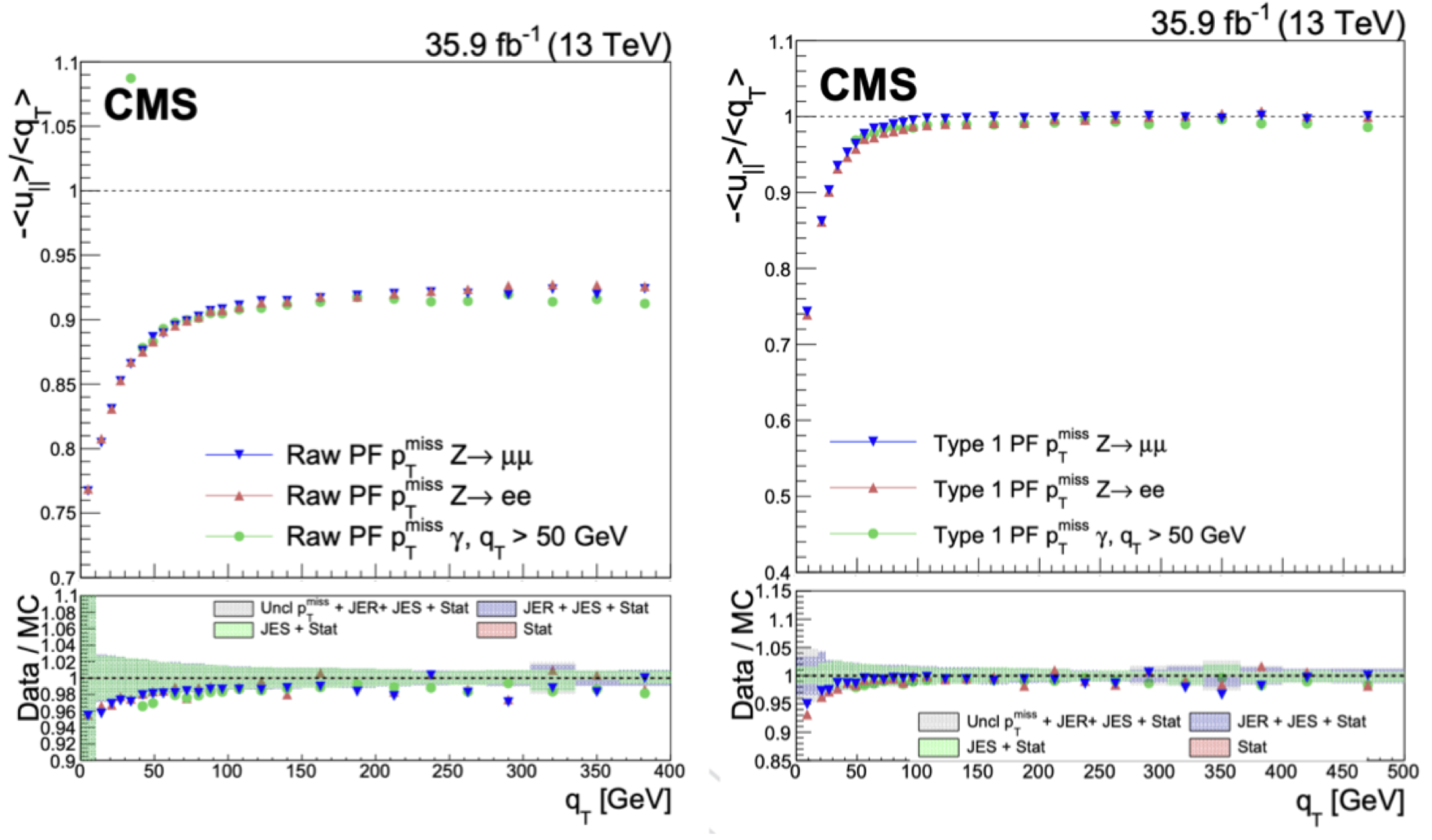 Specifically, the mean of the distribution of the magnitude of \(q_{T} + u_{\parallel}\), is used to estimate the MET response, whereas the RMS of \(q_{T} + u_{\parallel}\) and \(u_{\perp}\) distributions are used to estimate the MET resolution in the axis parallel and perpendicular to the Z boson, respectively.