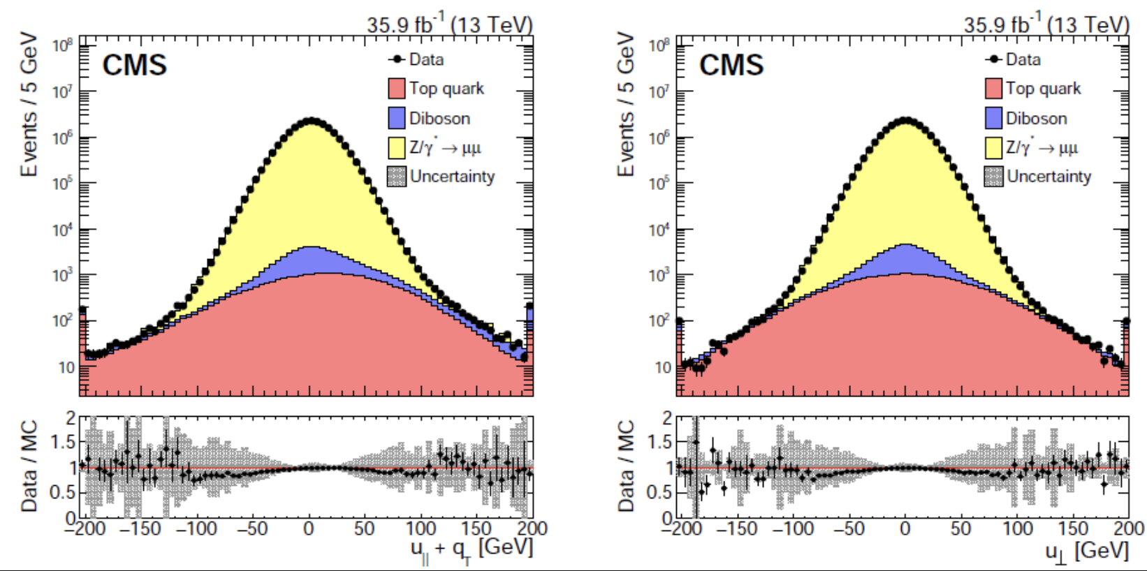 perpendicular (\(u_{\perp}\)) to the boson axis: sensitive to isotropic effects like pileup