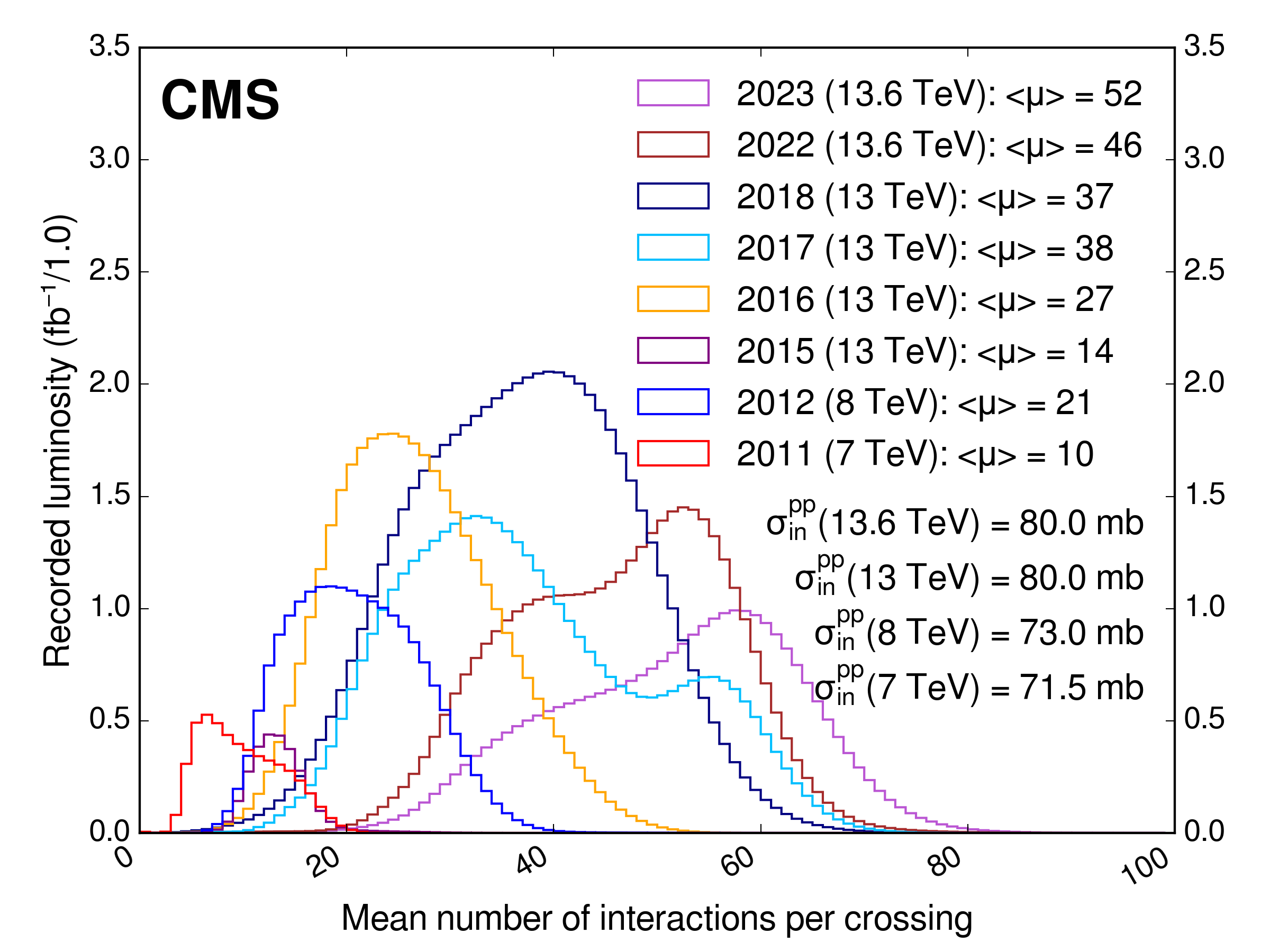 - mu: the true mean number of the poisson distribution for this event from which the number of interactions each bunch crossing has been sampled